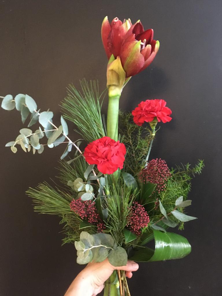 Joulu:Korkea amarylliskimppu neilikoilla, skimmialla, eucalyptuksella ja erilaisilla havuilla.