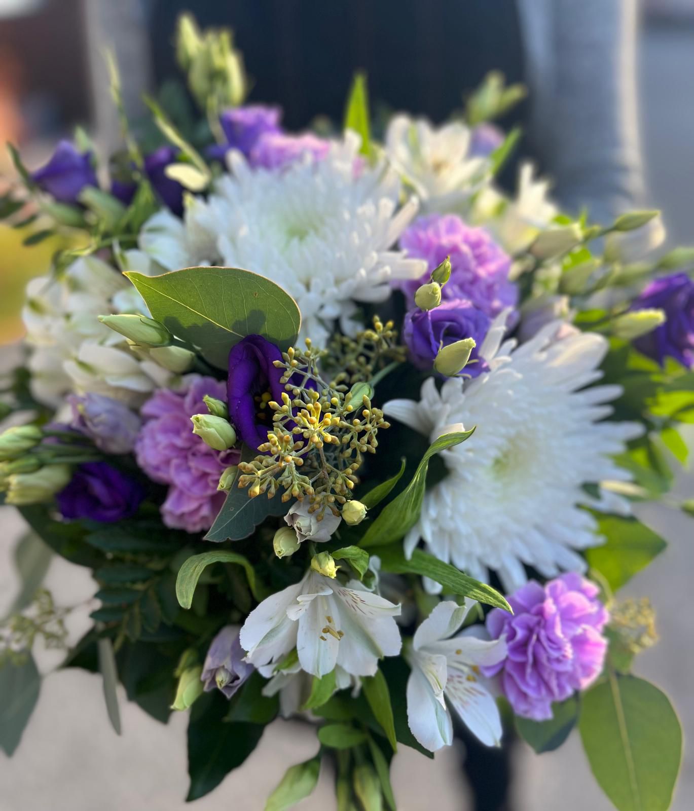 Kukat: valkoinen krysantteemi, Inkalilja, lilaa Eustoma ja Neilikka vihreillä.