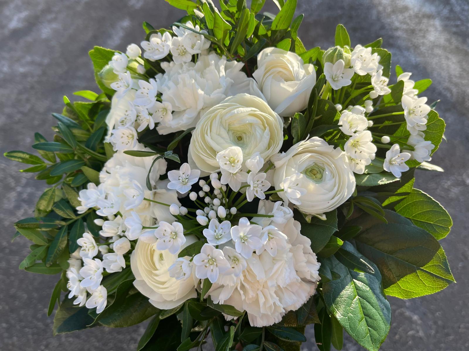 Floristin valinta – Valkosävyinen kaunis kimppu kauden leikkokuista. Kimppu matala, pyöreä.