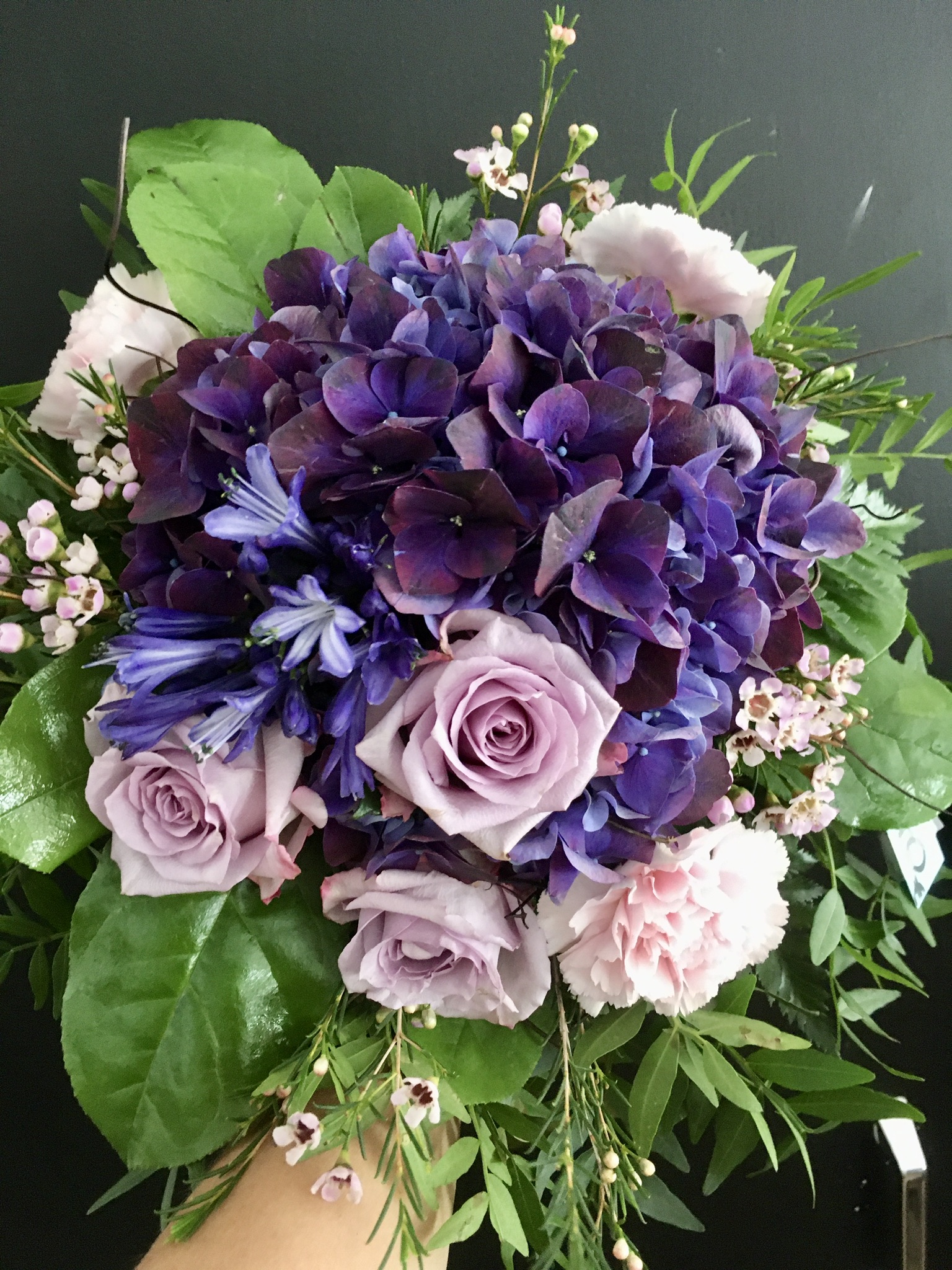 Matala, pyöreä kimppu, sininen/ liila. Hortensia, Ruusu ja muita kauden kukkia.