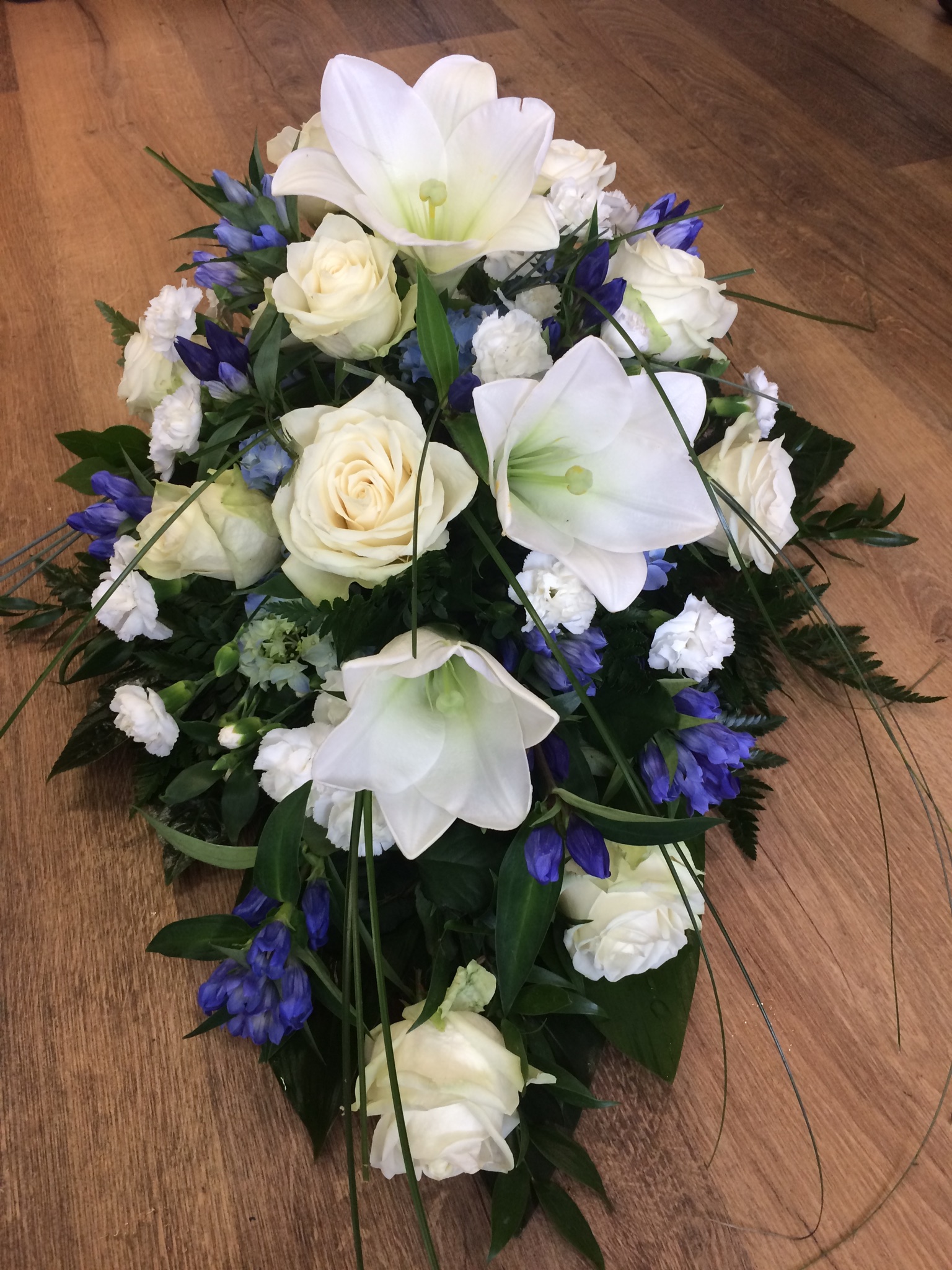 Surulaite Valkolilja, valkoinen ruusu ja sininen kukka.