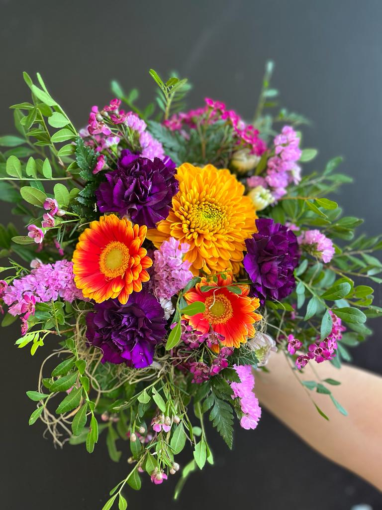 Värikäs matala rönsyilevä kimppu – Gerbera Neilikka Krysanteemi ja muita kauden kukkia.